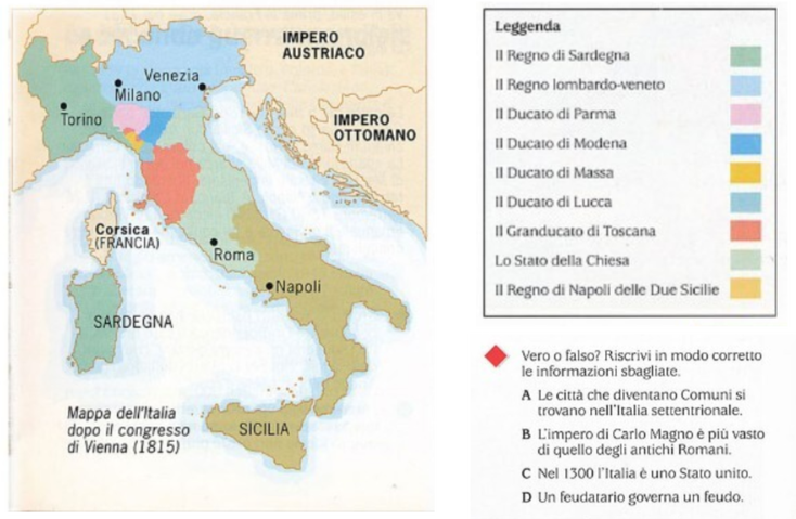 Un mosaico chiamato ItaliaLa penisola italiana è stata, attraverso i secoli, dominata da potenze straniere. La Francia e l’Austria nel nord e gli Arabi, la Spagna e la Francia nel sud si sono alternati nella dominazione del paese, frazionato in tanti Stati.