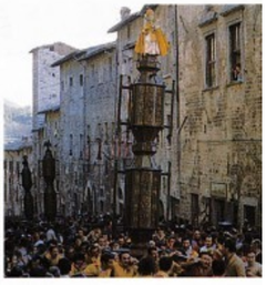 L'ultima domenica di maggio a Gubbio, in Umbria, anziché la statua di un santo, si portano in processione degli enormi e pesantissimi ceri. Il percorso viene fatto di corsa e vince chi va più veloce.